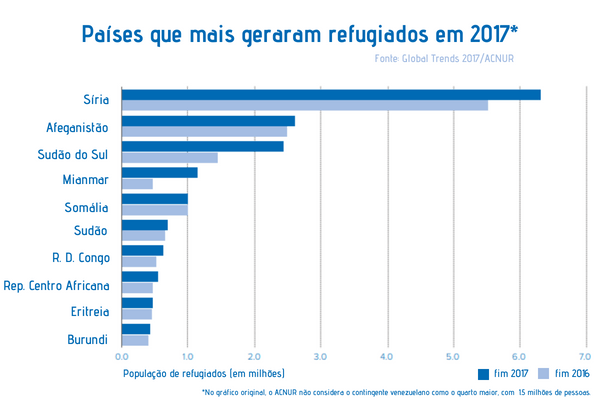 De acordo com dados do ACNUR (Alto Comissariado das Nações Unidas para os Refugiados), desde 2013, quando a crise humanitária na Venezuela se agravou, quase 1,5 milhões de pessoas deixaram o país. Esse contingente só é menor do que o de sírios, afegãos e sudaneses do sul. Os dados revelam a dimensão da maior crise humanitária em curso desde a 2a Guerra Mundial: 68,5 milhões de pessoas foram forçadas a se deslocarem de seus lares – inclusive dentro de seu próprio país, nos dados referentes a 2017.