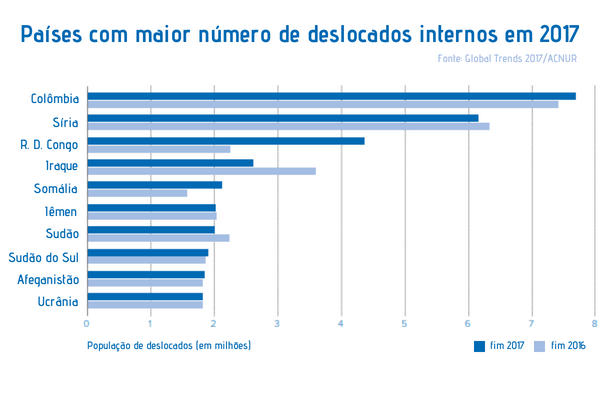 Isso equivale a dizer que a cada minuto, 31 pessoas sofrem com deslocamentos forçados no mundo. Essa realidade não é exclusiva de países que vivem em guerra, como é o caso da Síria, mas também de países que passaram por graves violações de direitos humanos ou conflitos armados internos, como é o caso da Colômbia, onde 7,7 milhões de pessoas foram obrigadas a mudar de localidade por conta do conflito que se arrasta desde a década de 1970.